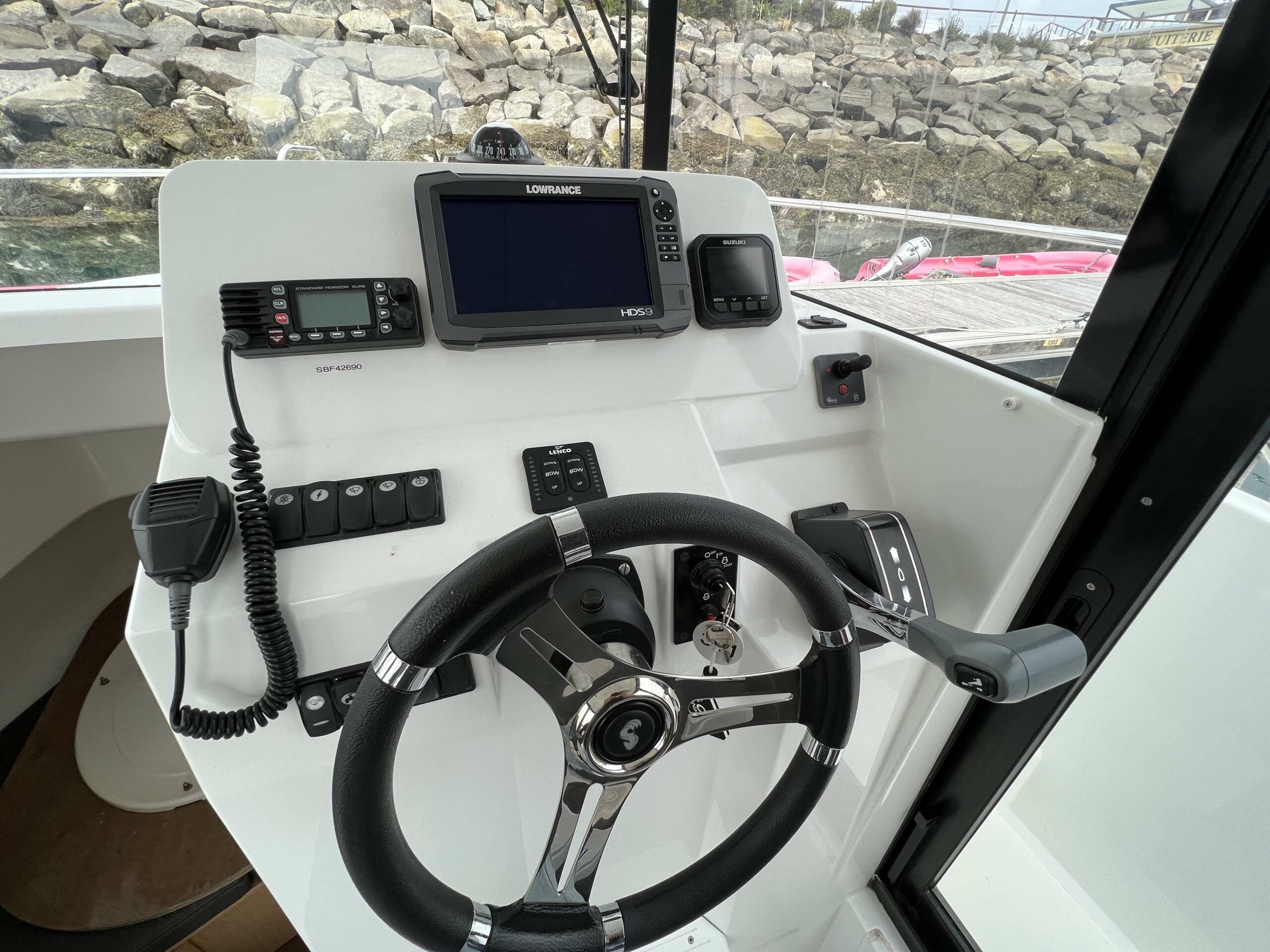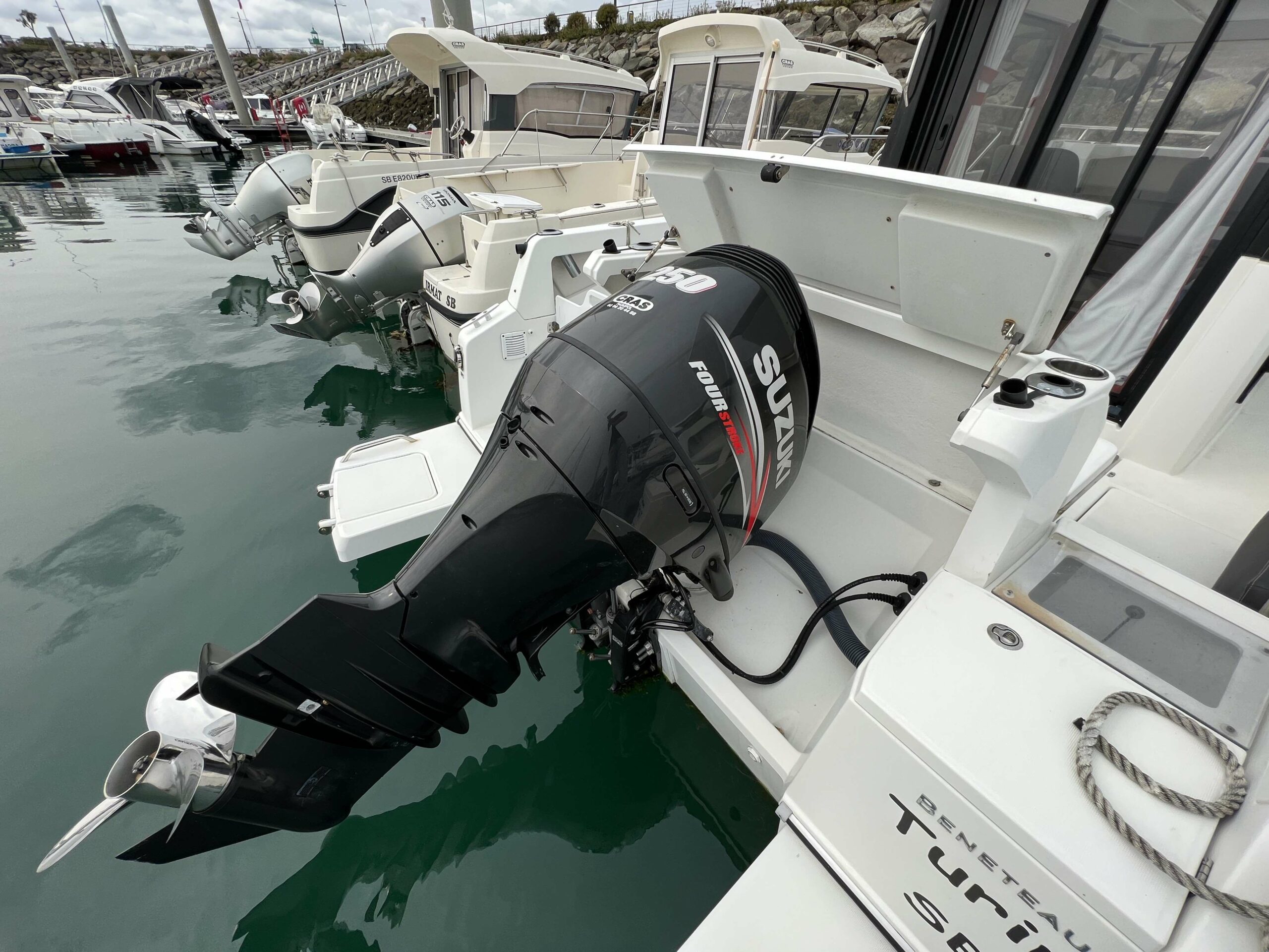 Motorisation SUZUKI 250 cv 4 temps injection année 2016 totalisant 225 heures de navigation équipé d’une direction hydraulique et commande par câbles.